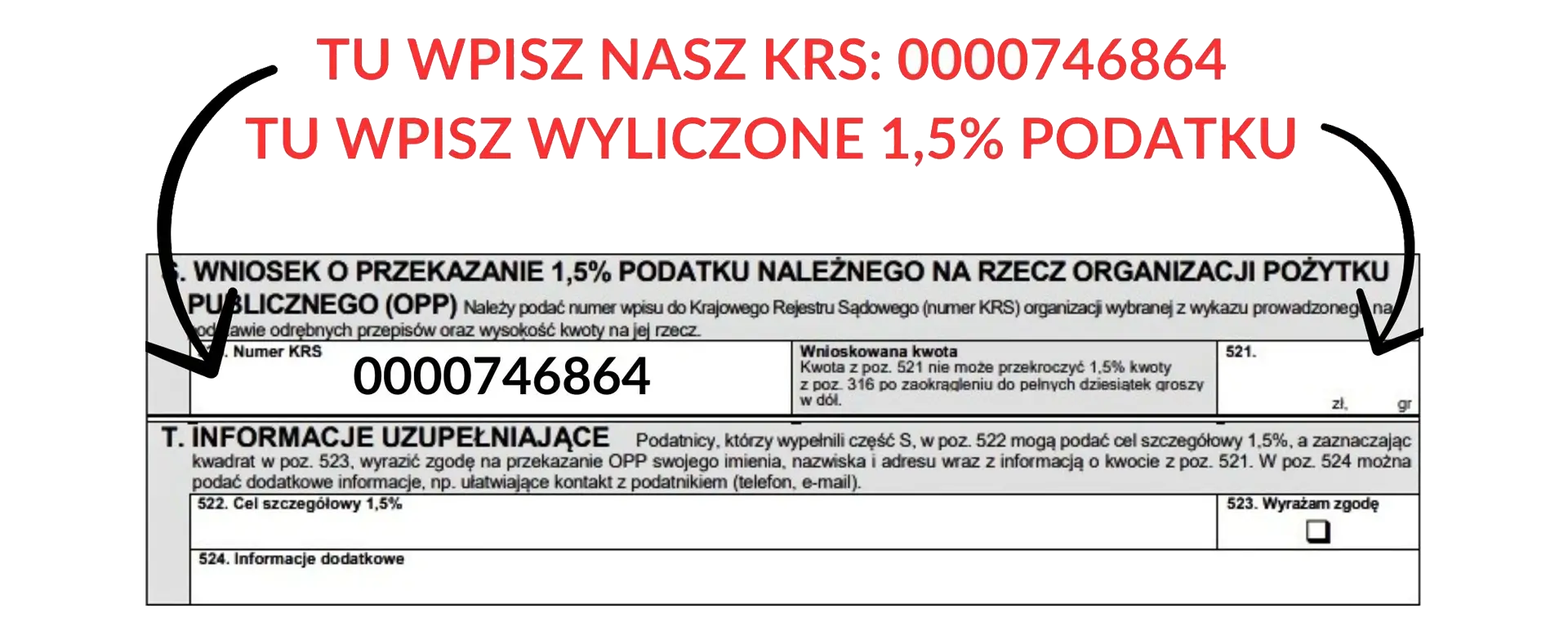 Aby przekazać 1,5% podatku na formularzu PIT-28, PIT-36, PIT-36L, PIT-37, PIT-38 lub PIT-39 w polu „Numer KRS” prosimy wskazać KRS 0000746864 oraz kwotę 1,5% obliczonego podatku.