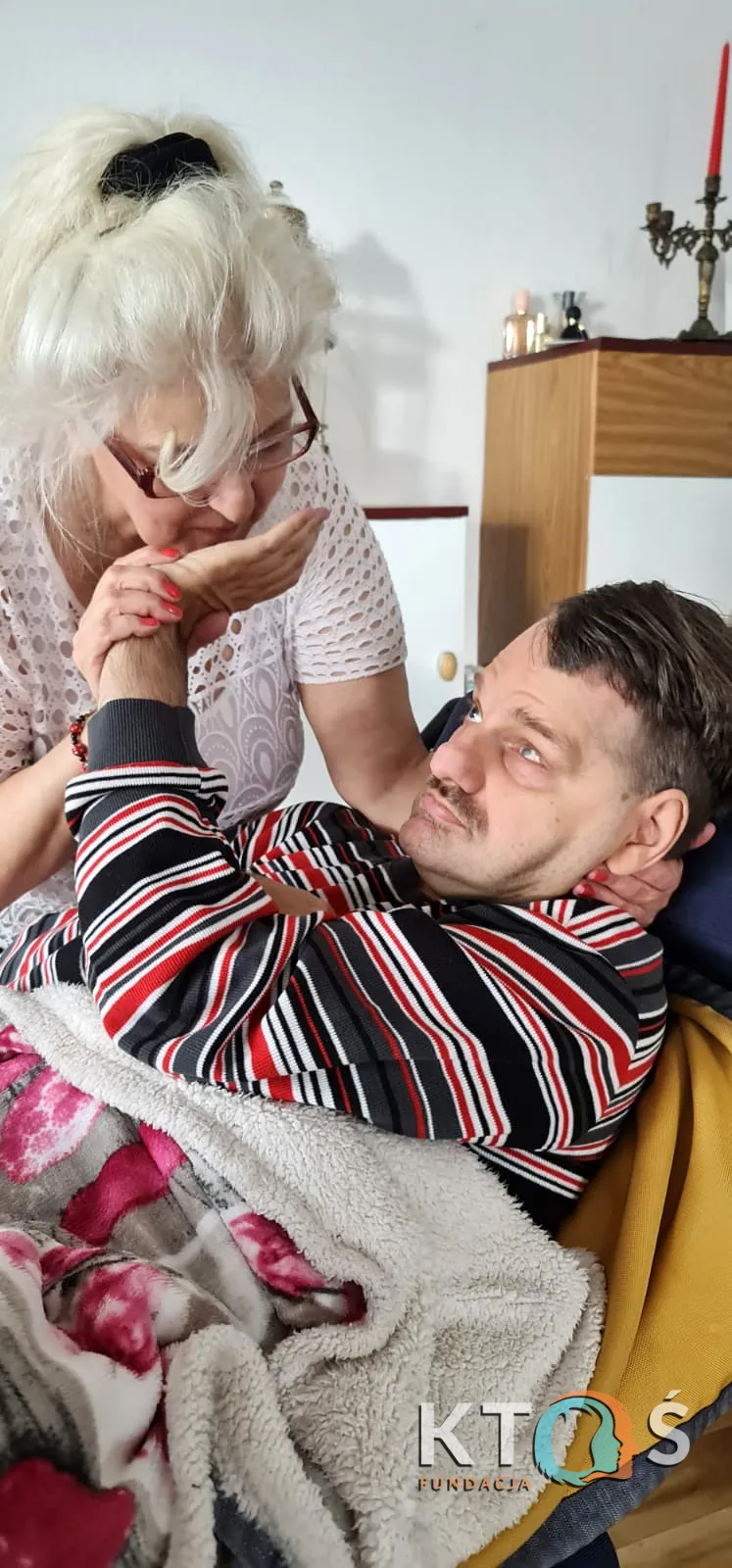 Pani Jola jest samotną mamą. Całą dobę opiekuje się swoim synem. Rafał ma 44 lata. Nie jest w stanie żyć samodzielnie. Urodził się z porażeniem mózgowym. Cierpi na epilepsję, nie widzi, nie mówi. I choć jest już dorosłym mężczyzną, wymaga opieki jak niemowlę. Pani Jola jest niewyobrażalnie zmęczona. Fizycznie i psychicznie. Potrzebuje chwili, kiedy KTOŚ zmieni ją przy łóżku syna i pomoże zregenerować siły.