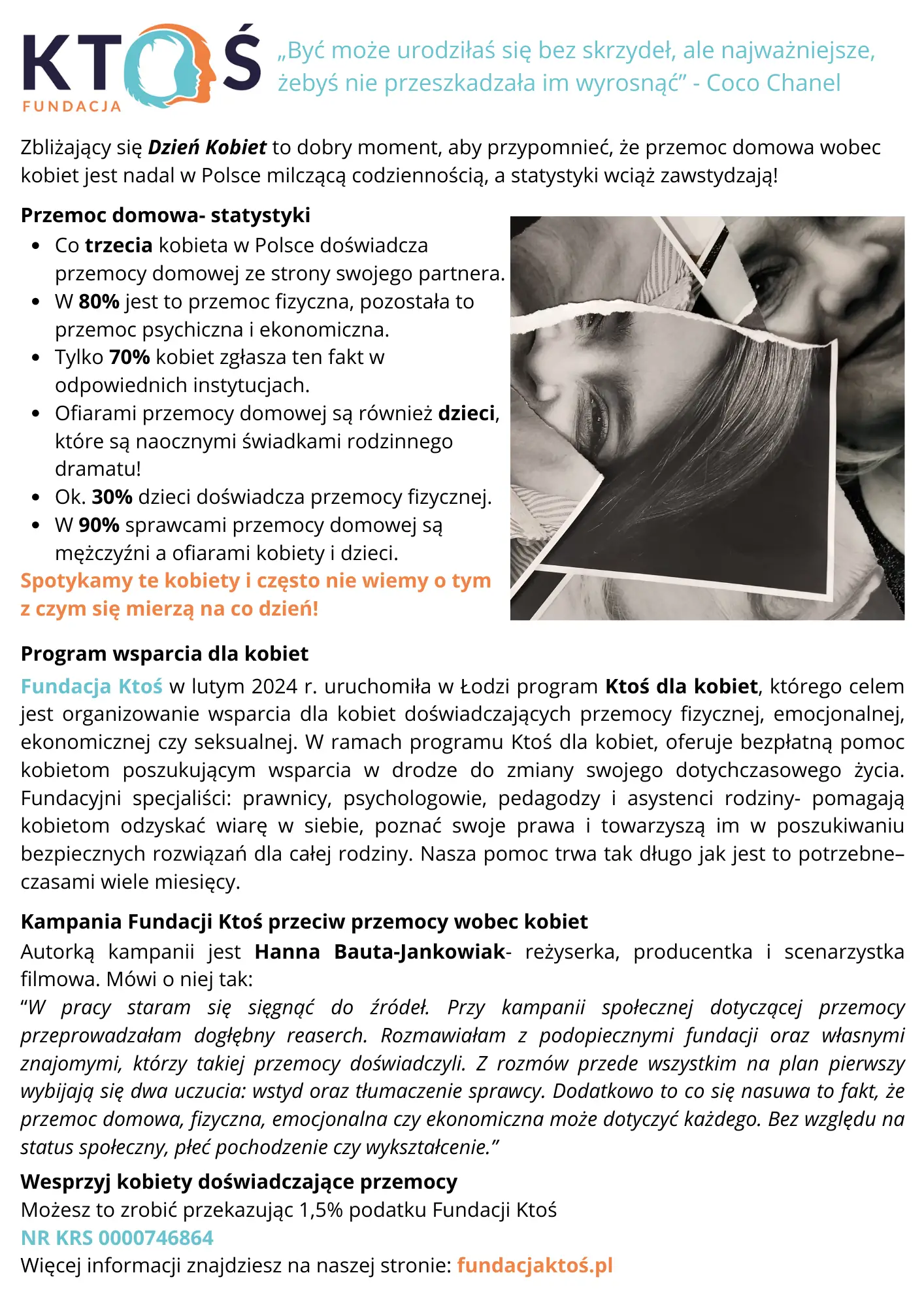 Dla mediów Fundacja KTOŚ otwiera nowe miejsce pomocy dla kobiet doświadczających przemocy w Łodzi Fundacja KTOŚ partnerem łódzkiej premiery filmu "Dom dobry" ANNA SZCZEPANIAK – Członek Zarządu Fundacji KTOŚ Informacja prasowa 28.09.2025 - Gala Konkursu w hołdzie Teresie Żylis z udziałem podopiecznych fundacji KTOŚ Fundacja KTOŚ ma już 7 lat Komuniat prasowy KTOŚ dla kobiet Briefing 3 lipca, godz 10, ul. Piotrkowska 118 Informacja prasowa 12.04.2025 Notka prasowa do mediów 17.02.2025 Magdalena Kijańska Bio Opieka wytchnieniowa historie Informacja prasowa - Fundacja Ktoś o programie Ktoś dla kobiet Fundacja Ktoś KTOŚ DLA KOBIET